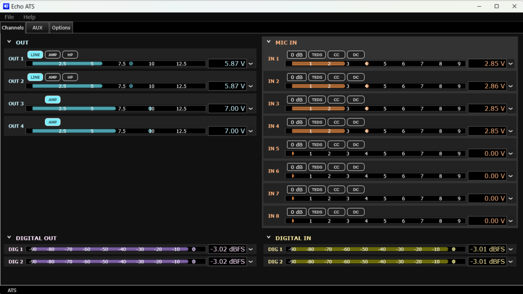 The Echo Control Panel has meters showing the audio activity on each input and output channel along with a readout of the signal levels. It allows the user to control all the various aspects of an ATS or AIO, such as input settings and output modes. It is also used to upload new firmware releases. The Control panel and it use is detailed in the ATS and AIO product manuals.