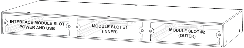 The AIO system supports various test modules for different applications. There are three module slots as shown above. The leftmost slot will always contain an Interface Module with the power supply, USB port, and control processor. The center and outer slots can contain different combinations of the following module types. The outer slot can be empty but the center slot must always be populated.